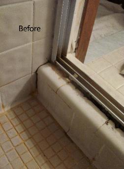 Before re-grouting, the old grout and caulk is removed or shaved down. Moldy grout is cut-out. Mike, the owner-operator of the